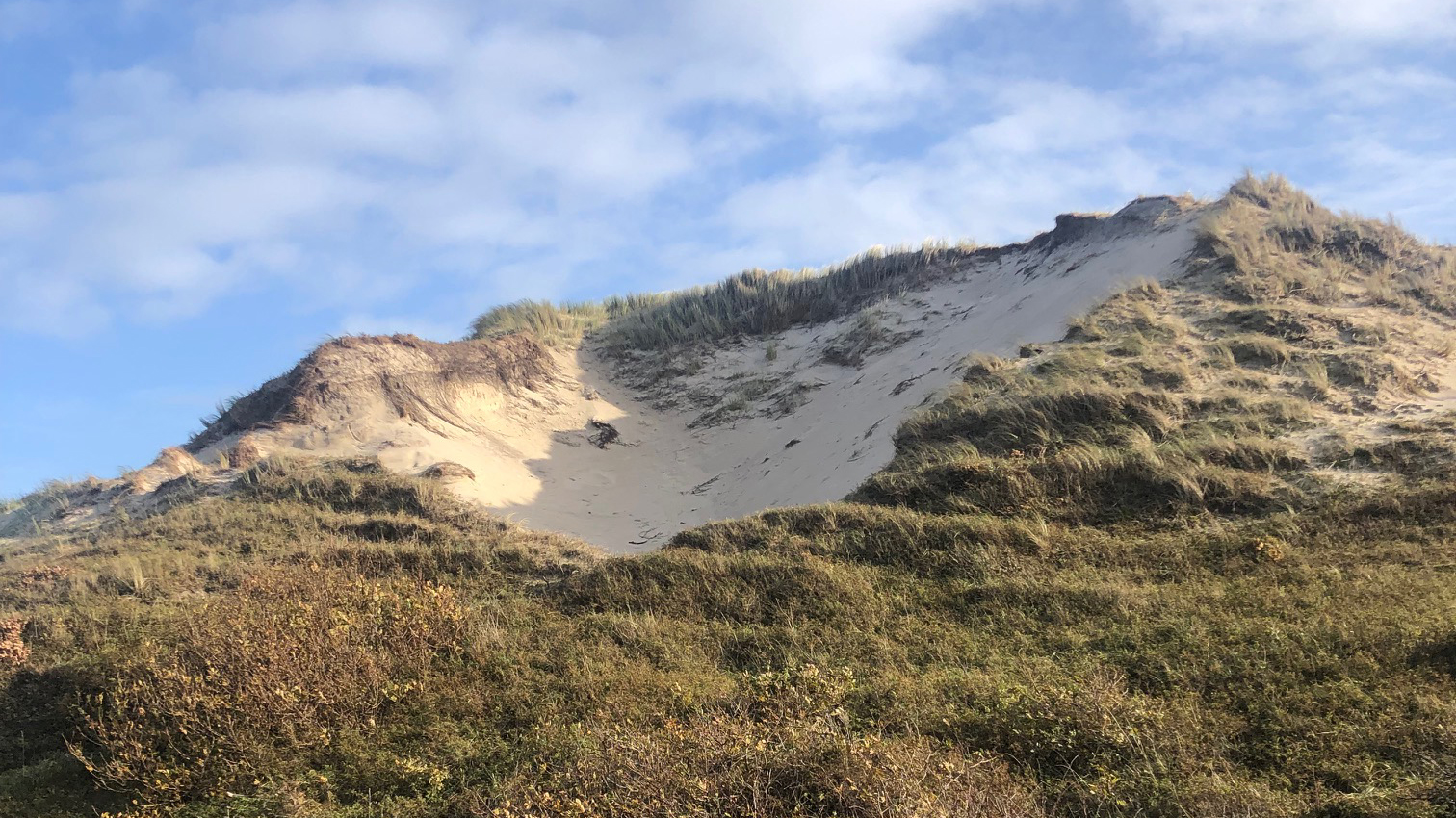 Zandduin met gras bedekte helling onder een blauwe lucht met enkele wolken.